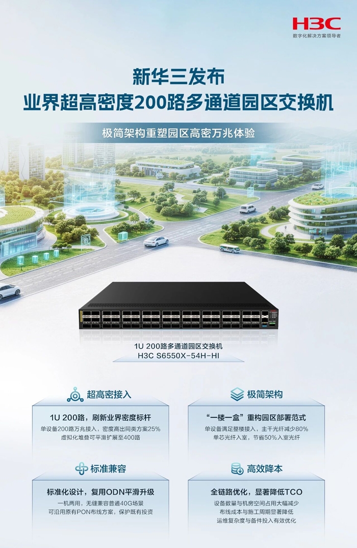 智慧城市网 产品评测】AI技术正加速向端侧应用场景渗透,园区网络也面临着前所未有的新需求,其核心已从提供基础连接,升级为支撑边缘侧AI应用的流畅使用,以保障高品质、确定性的业务体验。这对园区网络的端口密度、部署效率提出了全新要求。近日,紫光股份旗下新华三集团全新发布业界超高密度1U 200路多通道园区